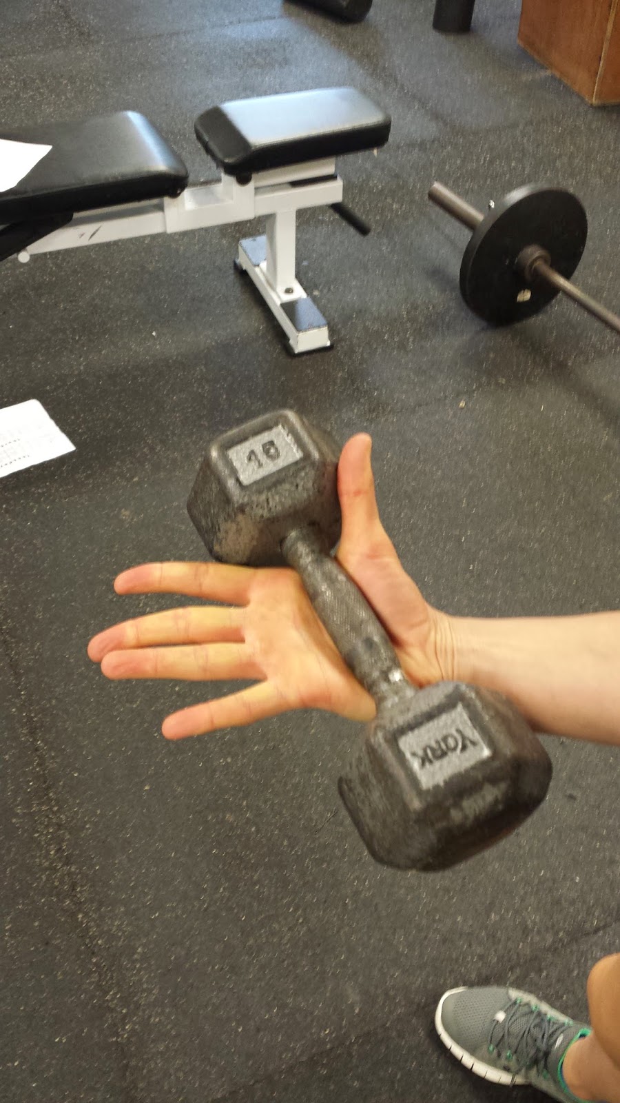 The picture on the right is in neutral position, or palms facing inward toward your body. This is a typical grip for hammer curls. (Think karate chop). By having the top bell resting on your hand, your ‘cheating’ yourself out of grip work by using the implement shape to your advantage. The same concept can be applied to using rope pulleys. ‘Resting’ your hands on the knobs minimizes hand work. You leave yourself open to inefficient form and compensation.