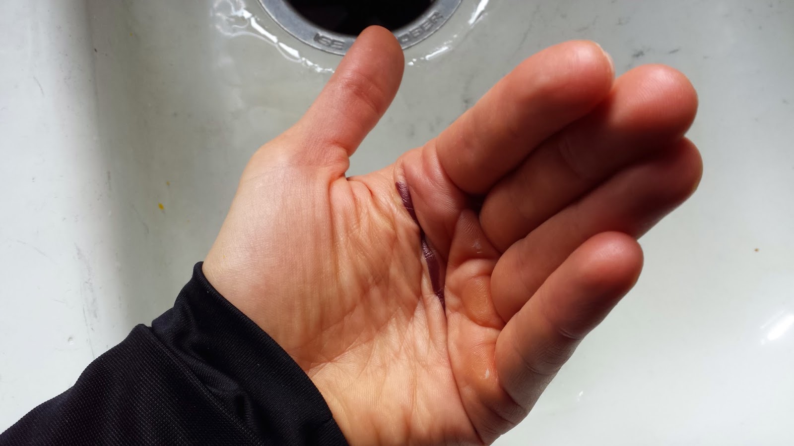 The ultimate grip builder and shoulder saver. Same mid-palm grip as marked above, but curl pinkies around first. The pinkies are typically the weakest digit and the first to unfurl. Start securing self there.