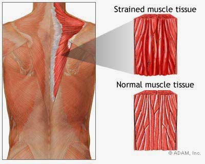 A strain is inflamed or slight (to severe) tears in muscle tissue: