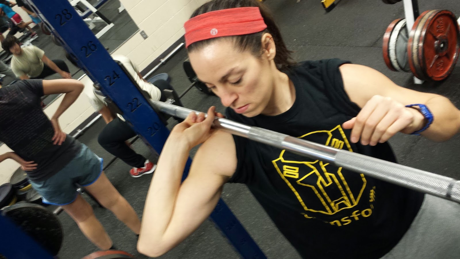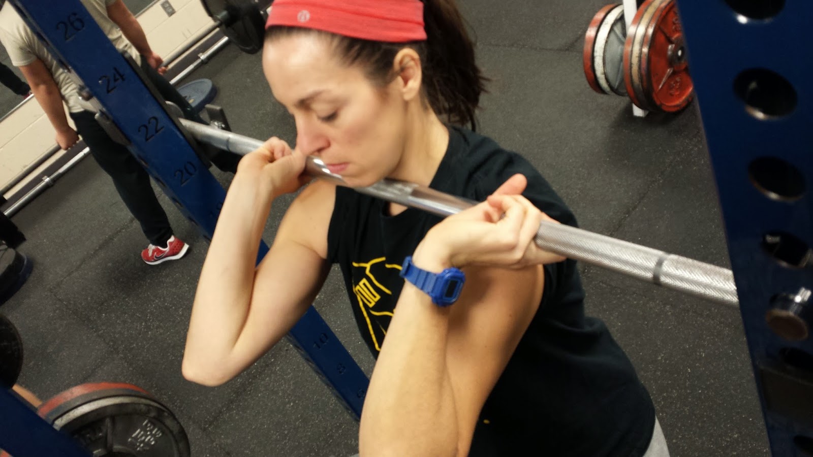 Keep elbows up throughout the entire squat. You’ll want to drop them as you descend.